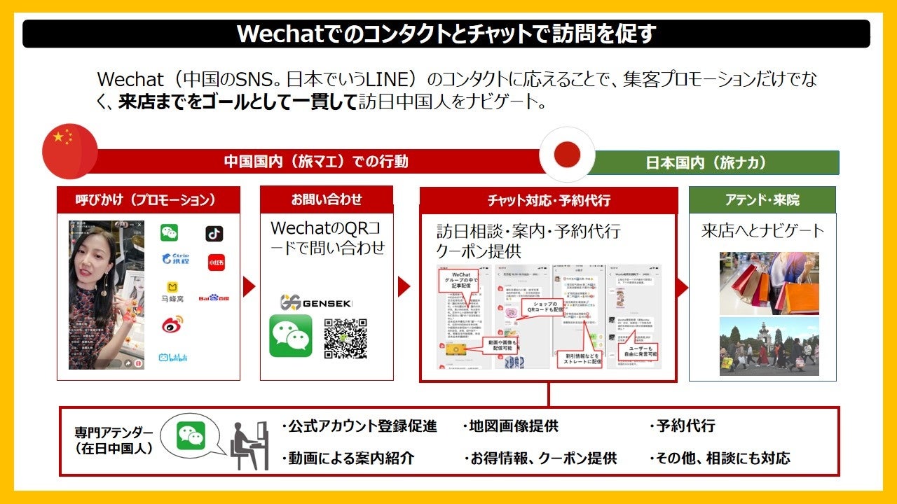 中国人の訪日旅行の意向が熱をおびてきています。コロナ渦前に勝るとも劣らない訪日中国人を迎えるカウントダウンがはじまっています。GENSEKI株式会社(代表取締役 神谷太)は訪日中国人を迎え入れたい日本の企業・施設・店舗向けにリサーチ・プランニング、プロモーションの実施と効果検証、そして、双方向のコミュニケーションによりターゲットをダイレクトにナビゲートするチャットコンタクトセンターのサービスを展開していきます。特に美容・医療、商業施設向けに注力し集客購買を促します。