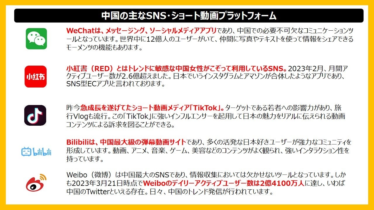 中国ではKOL(key Opinion Leader)と呼ばれるインフルエンサーの発信力が強い影響力を持っています。彼ら彼女を日本に招聘して体験交流により理解を深め、これをライブ配信や体験談などでKOL自らのアカウントで投稿することで注目化。即効性のある集客に貢献します。また、日本在住のKOLから日本を知っているからこその説得力ある推奨も効果を発揮します。