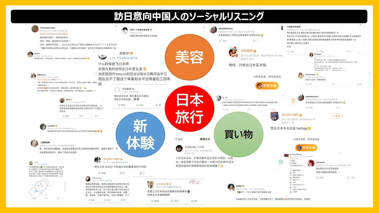中国主要SNSでのソーシャルリスニングをしてみると「化粧品やファッショングッツを買いに行きたい。」といった買い物ニーズはもちろんのこと「日本で髪を染めてパーマをかけたい。」といった美容体験のニーズや、「ここ最近出来た新しいスポットに行ってみたい。」といった我先にと新体験を望む声が聞こえてきます。