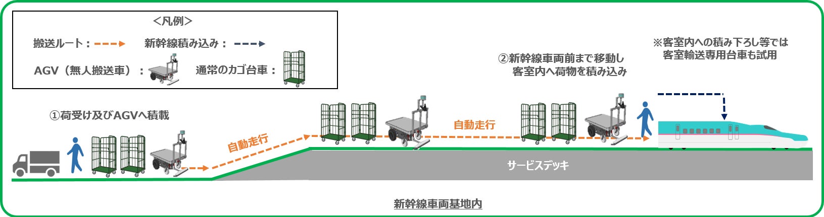 今回、主に新幹線客室への積み下ろし等で試用し、生産性等を検証します。