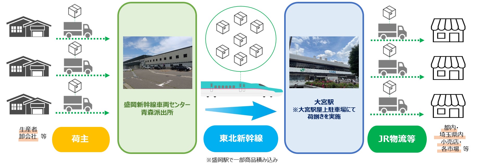 | 〇東日本旅客鉄道株式会社(以下、「JR東日本」)と株式会社ジェイアール東日本物流(以下、「JR物流」)は、新幹線を活用した高速・多量荷物輸送により、「物流の2024年問題」や「CO2排出量削減」、「地方創生」等、社会的課題の解決を目的に列車荷物輸送サービス「はこビュン」による多量輸送のトライアルを実施します。 〇今回初めての取り組みとして、青森県にある新幹線車両基地(盛岡新幹線車両センター青森派出所)から荷物の積み込みを行い、加えて、AGV(無人搬送車)や客室輸送専用台車等も使用し、今後の実用化に向けた課題の抽出を行います。 〇本輸送では、「はこビュン」のサービス開始以来、最大規模の荷量を新幹線3両を使用して積み込みを行います。今後は新幹線による多量輸送の定期化により、地方の魅力を首都圏の巨大マーケットと繋ぐことで新たな価値を創造できるよう、トライアルを継続的に実施していきます。 |