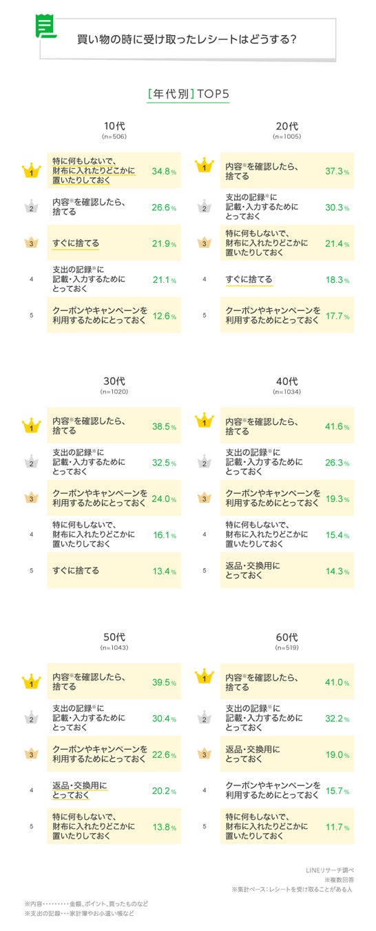 このたびLINEリサーチでは、日本全国の男女を対象に、レシートを受け取る人の割合や、受け取ったレシートをどのようにすることが多いかについて調査しましたので、その結果をお知らせいたします。