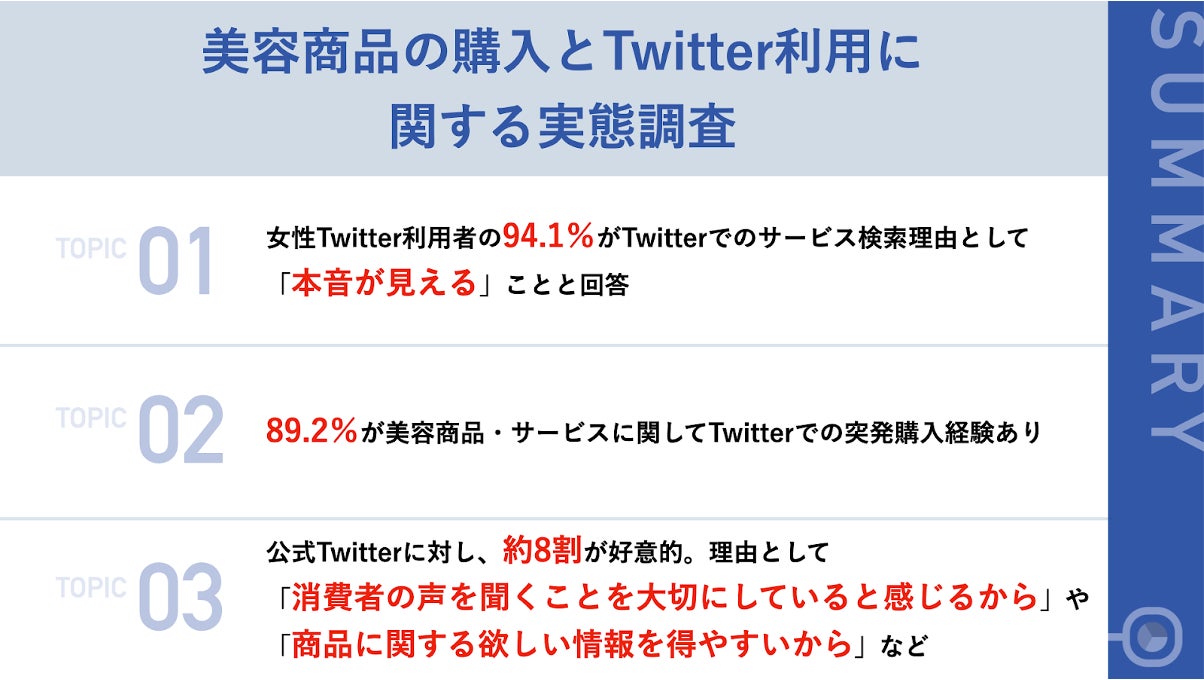 調査の結果、Twitterを日常的に利用している女性の多くは、美容・エステ関連のサービスや商品を購入する際にTwitterの口コミを参考にしています。また、口コミを見て突発的に買い物をした経験がある女性は、89.2%と多い結果となっています。また、Twitter公式アカウントに対しては、「消費者の声を聞くことを大切にしている」と感じたり、「商品に関する欲しい情報が得やすい」といった理由から、多くの人がポジティブな印象を持っていることがわかりました。