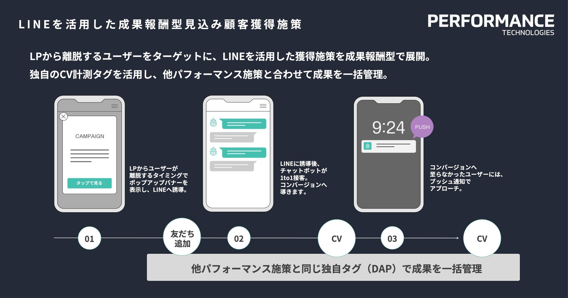 Performance Technologiesでは、PRと成果報酬型広告施策を掛け合わせたパフォーマンスマーケティングサービスをこれまで提供してきた中で、LP誘導後の離脱対策や見込み顧客の引き上げといった領域におけるLINEの有効性を実感してきました。この度の提携により、Performance Technologiesが提供する一連の成果報酬型広告施策によってLPに流入後、離脱するユーザーをターゲットに、LINEを活用した獲得施策を成果報酬型で展開。友だち追加と商品購入でCVポイントを段階設定しつつ、独自のCV計測タグを活用可能にすることで、他成果報酬型広告施策と合わせた成果の一括管理を実現いたします。