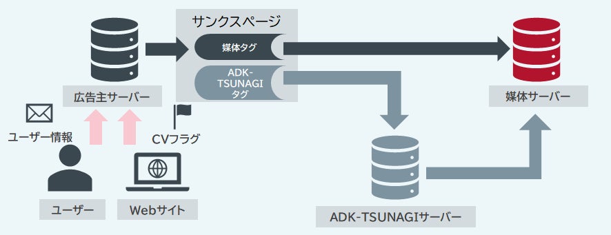 クライアント企業のサーバーと広告媒体のサーバーをAPIで接続し、ハッシュ化されたメールアドレスなどの個人関連情報をキーにコンバージョン情報を突合させ、精緻にCVを計測する技術