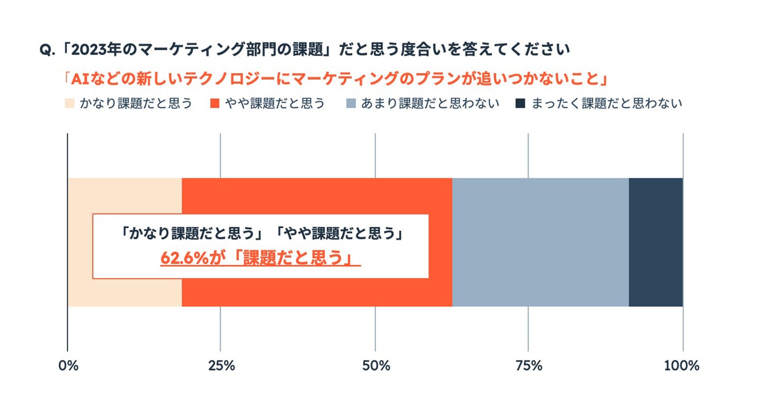 ChatGPTなどのジェネレーティブAIの台頭により、マーケティング従事者の意識には変化が生まれています。回答者の91.2%が「マーケティング施策の効果を高めるためにAIなど新しいテクノロジーの情報収集や活用が必要である」と回答している一方、「AIなどの新しいテクノロジーにマーケティングのプランが追いつかない」ことを回答者の62.6%が課題に感じており、「AIなどの最新のテクノロジーを活用することへの漠然とした不安がある」と答えた回答者は55.5%と半数を超えました。