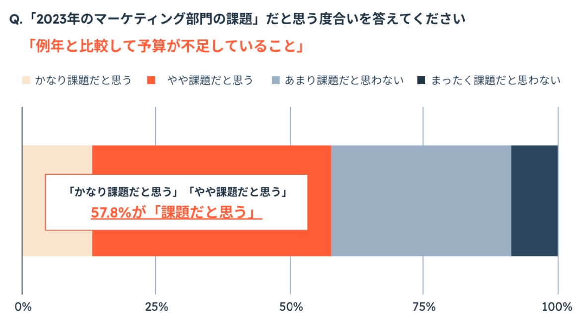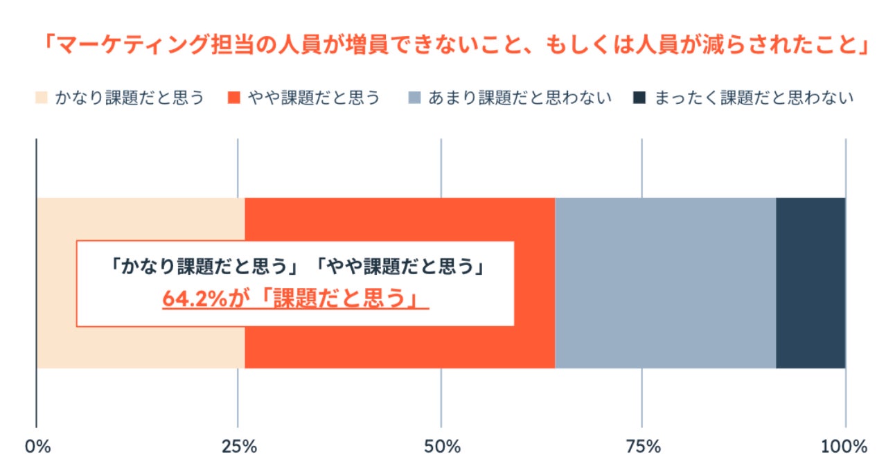 「例年と比較して予算が不足していることを課題に感じている」回答者は全体の約6割、「マーケティング担当の人員が増員できないこと、もしくは人員が減らされたことを課題に感じている」回答者が64.2%にのぼりました。