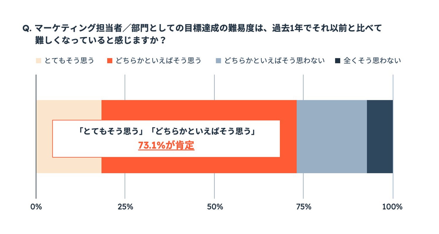 上述のような外部環境及びマーケティング組織自体の変化に伴い、回答者全体の73.1%が「過去1年で目標達成の難易度が上がった」と回答しています。また、全体の67%が「過去1年で社内でマーケティング施策のROIを厳しく問われるようになった」と回答しています。