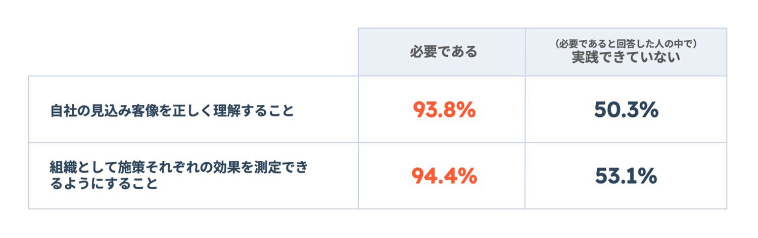 マーケティング施策のROI(費用対効果)を高めるために必要なことを尋ねた問いに対して、9割を超える回答者が「効果測定」と「顧客理解」を「必要である」と回答しました。その一方、それぞれの実践状況を見てみると、いずれの要素も「必要である」と回答した人の半数以上が「実践できていない」と回答しています。