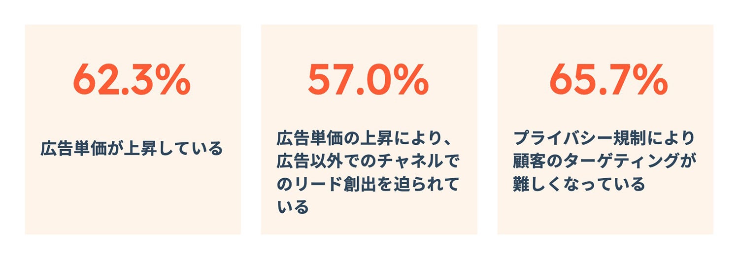 調査対象となったマーケティング従事者のうち、「広告費の高騰」に課題を感じている回答者は62.3%にのぼりました。また、広告費の高騰に伴い「広告以外のチャネルでのリード創出に迫られている」とことが課題だと回答した人は全体の57.0%、また「プライバシー規制により顧客のターゲティングが難しくなっている」ことが課題あると回答した人は全体の65.7%でした。見込み客にリーチすることがコストの面においても、実践手段の面においても、困難になっていることが浮き彫りになりました。