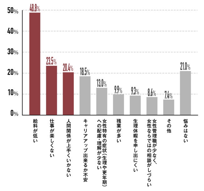「給料が低い」が48.8%でトップの結果。シングル50%女性は自分の収入だけで生活していかなければならないため、お金の悩みは大きいです。女性は男性に比べて平均年収が低いことも不安要因となっていると考えられます。女性がさらに活躍し、収入アップできる職場環境整備が求められるでしょう。