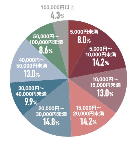 ボリュームゾーンは5,000円〜50,000円と幅広く分散されている結果となりました。世帯年収別にみると、年収400万円未満は10,000〜20,000円、年収400〜750万円未満は15,000〜50,000円、年収750万円以上は50,000円以上とボリュームゾーンが分かれます。シングル女性といえども、収入や生活環境はさまざまであるため、商品・サービスのターゲットに合わせた訴求が必要となるでしょう。