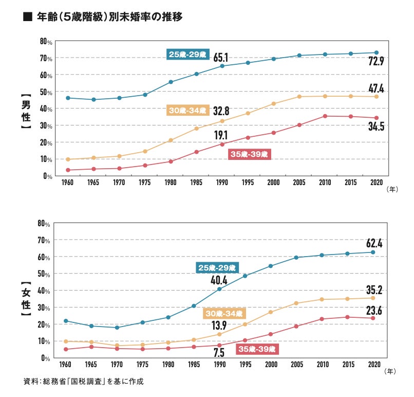 「少子化社会対策白書」(2022年6月内閣府)によると「生涯未婚率(50歳時未婚率)」は1970年には男性1.7% 、女性3.3%だったのに対して、2020年には男性28.3%女性17.8%と上昇しています。女性の社会進出の拡大や、結婚・家族観の多様化、非正規労働者の増加、 男女のマッチング機会の減少などが要因と推測されています。また、国立社会保障・人口問題研究所が2022年に発表した「出生動向基本調査(独身者調査)」(対象:18〜34歳未婚者)では、「一生結婚するつもりはない」と考える人の割合は、1987年に男性4.5%、女性4.6%だったのに対して、2021年は男性17.3%、女性14.6%と上昇傾向です。このことから、今後もシングル男性・シングル女性の増加とマーケットの拡大が予想されます。