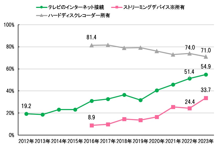 ②テレビスクリーンのネット化は加速し、テレビのインターネット接続は54.9%、ストリーミングデバイス所有は33.7%