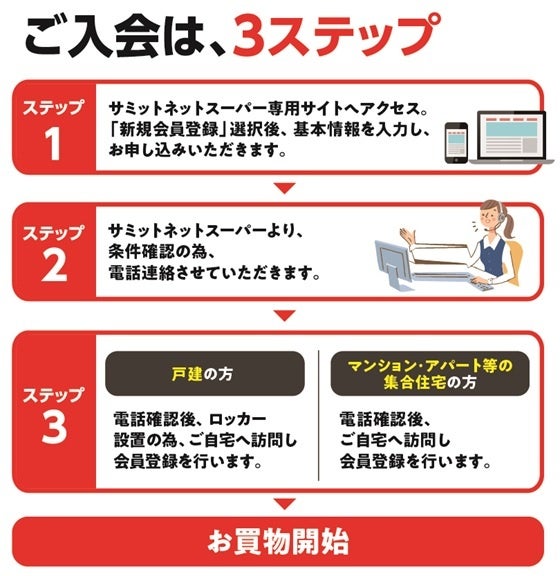 スマートフォンやパソコンからご注文いただいた商品を、サミットの従業員がお客様の代わりにサミットの店舗で商品を選定し、お客様のご自宅にお届けします。