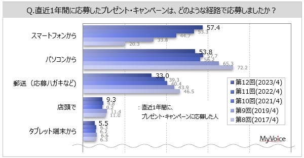 直近1年間に応募したプレゼント・キャンペーンの応募経路は(複数回答)、「スマートフォンから」が応募者の57.4%、「パソコンから」が53.8%、「郵送」が33.0%となっています。過去調査と比べて、「スマートフォンから」は増加傾向、「パソコンから」「郵送」は減少傾向です。