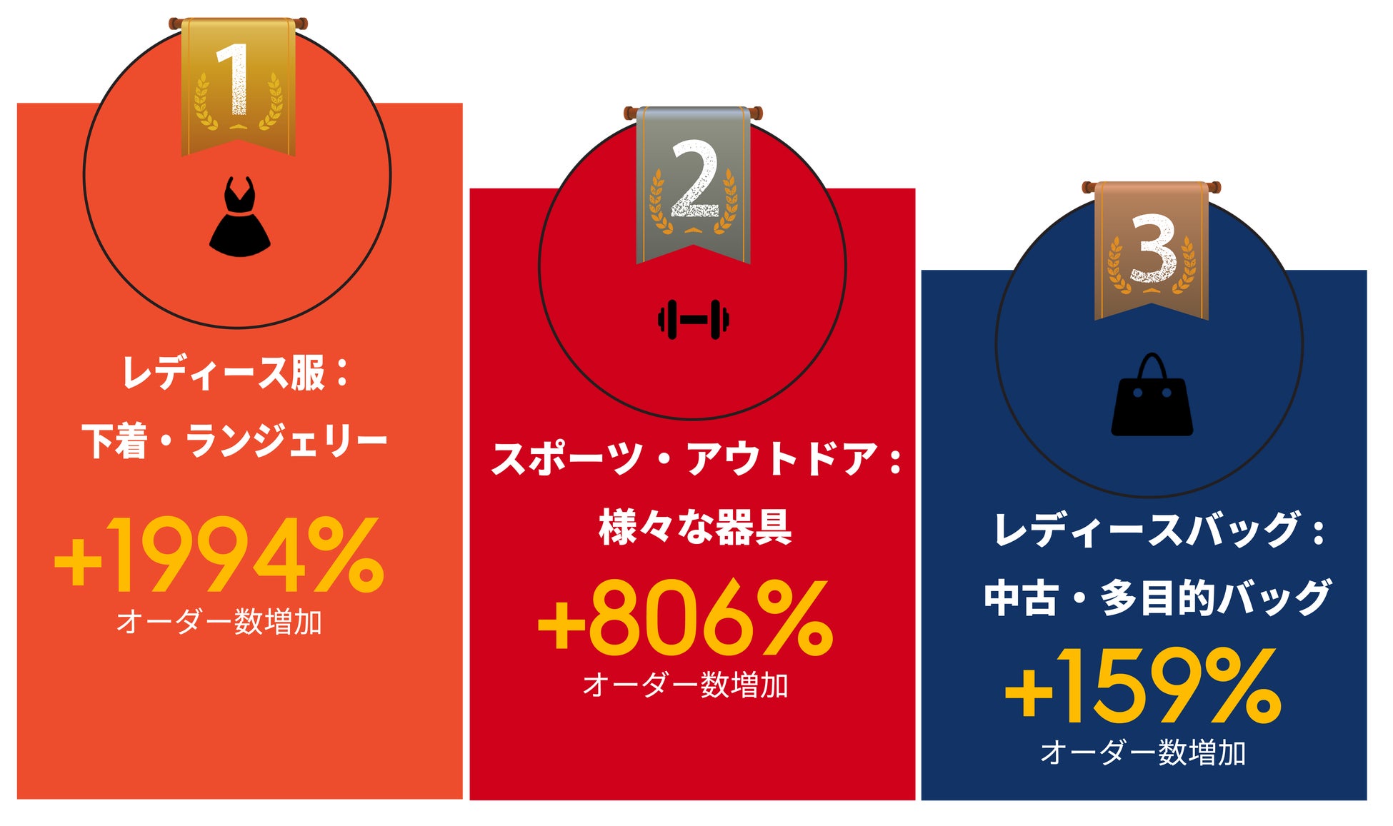 レディース服カテゴリーの下着・ランジェリー商品は、昨年度と比較するとオーダー数が+1994%の顕著な成長を記録し、成長率の高いカテゴリーで第1位を獲得しています。そして、スポーツ・アウトドアの様々な器具は+806%、レディースバッグの中古・多目的バッグは+159%のオーダー数増加でそれぞれ成長率 第2位と第3位となりました。