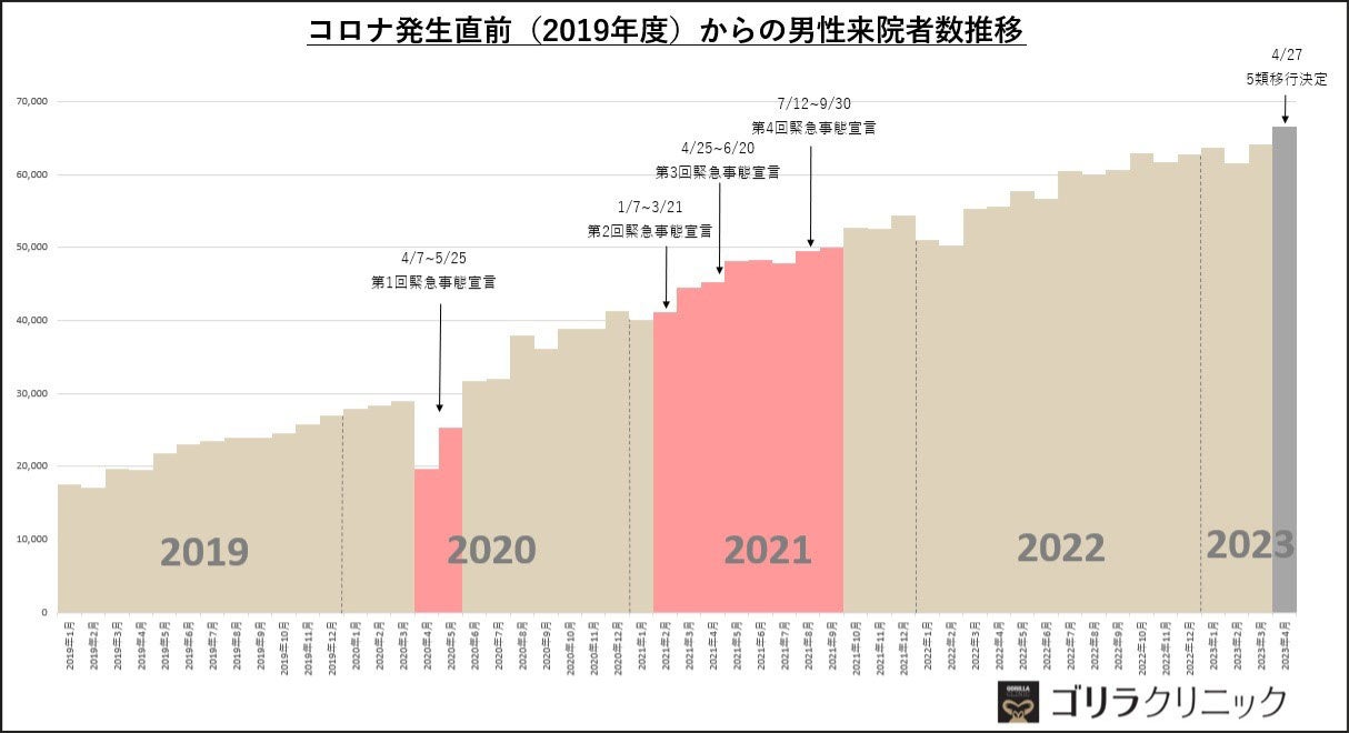 全国に22院展開する男性専門の総合美容クリニック『ゴリラクリニック』(医療法人社団十二会・東京都新宿区・総院長 稲見文彦)の場合、上記のグラフの通り、1回目の緊急事態宣言が発令された2020年4月・5月は不要不急の外出自粛やテレワークの活用もあり来院者数はいったん落ち込むものの、翌6月には回復。