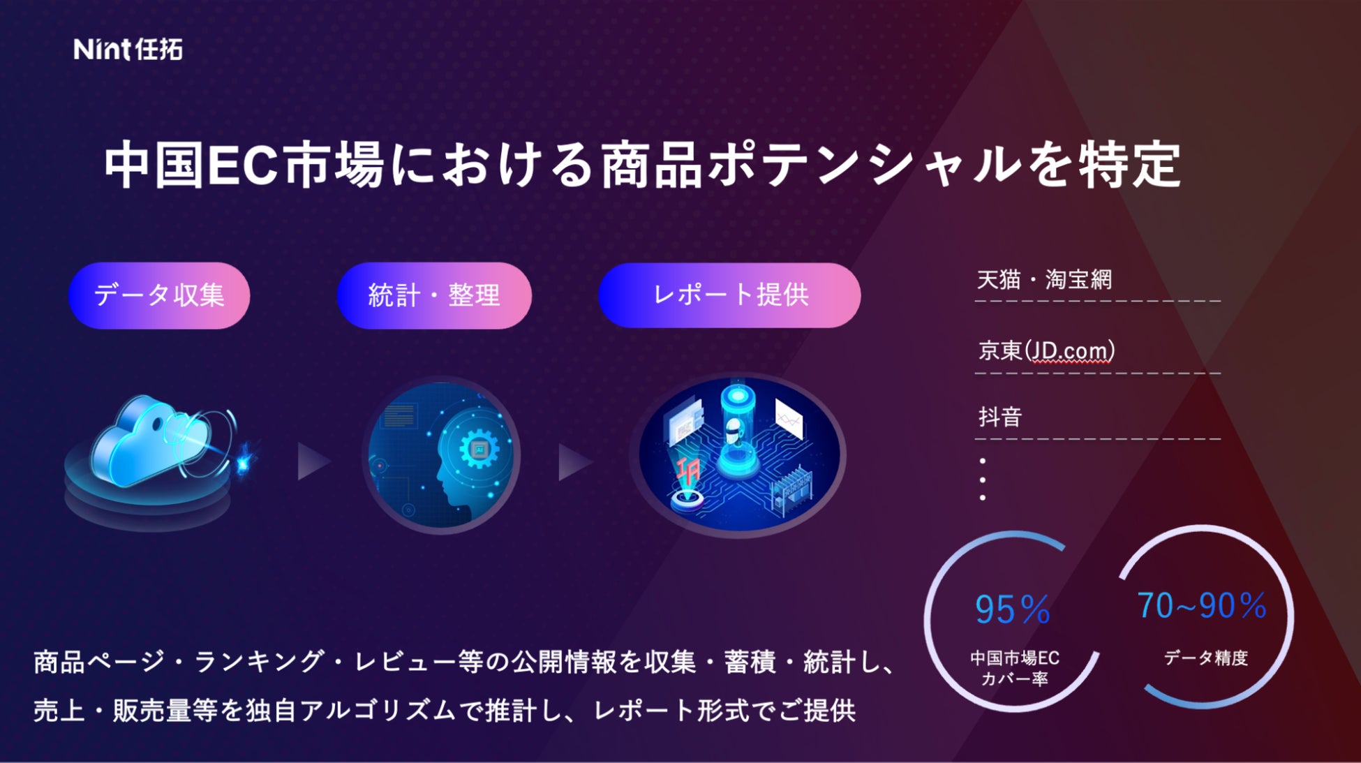 こうした課題に対応するため、株式会社Nintは10年以上にわたり、累計4,000社以上の企業に対してECデータ分析サービスを提供してきた経験を活かし、「中国市場における商品の可能性を探る」ことを目的とした「ポテンシャルリサーチサービス」の提供を開始いたしました。