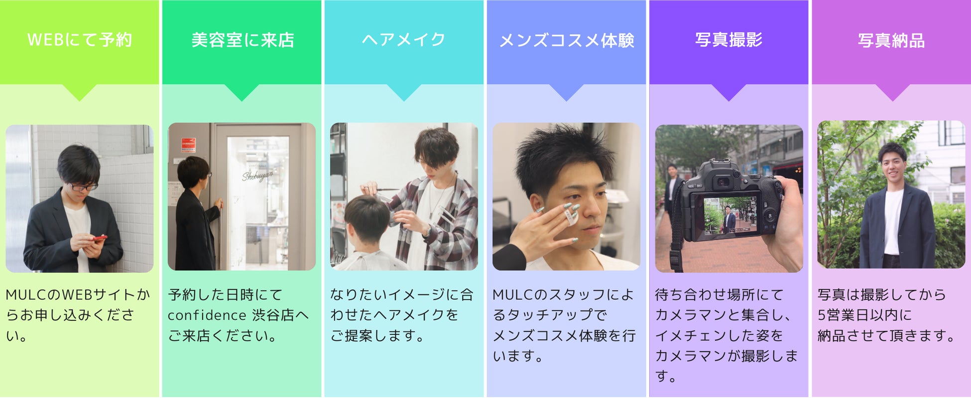 ①WEBにて予約/②美容室に来店/③ヘアメイク/④メンズコスメ体験/⑤写真撮影/⑥写真納品