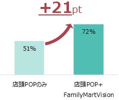 また、ファミペイアンケート調査において、ブランドリニューアルした「ジョージア」の認知度は、店頭POPのみを経由した認知率に対し、店頭POP+FamilyMartVision経由での認知度が21ポイント高いという結果となりました。アンケート調査結果からは、従来の店頭プロモーションにFamilyMartVisonが加わることにより、「ジョージア」のブランドリニューアルをより多くのお客さまに伝えられていることがわかりました。