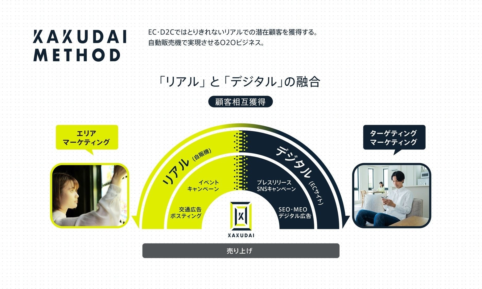 「KAKUDAI」とは、無人の自動販売機 “店舗” の出店と人による運用支援サービスです。サービスを提供することで自動販売機出店への参入課題が無くなり、出店・場所・運用まで全てオールインワンでサポートします。