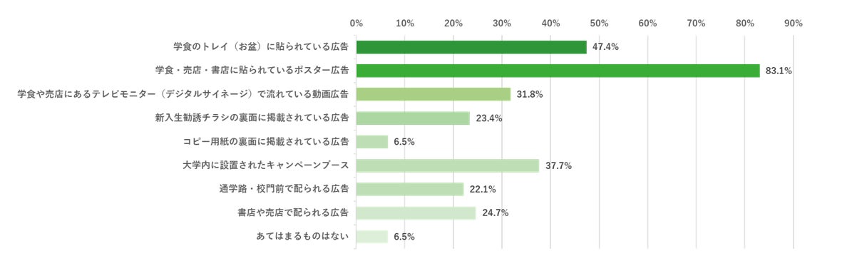 大学で見たことのある広告については、大学内ポスター広告がトップとなりました。次いで学食トレイ広告・キャンペーンブース・デジタルサイネージが続いており、利用頻度が高い場所での広告は認知度が高い傾向にあると考えられます。