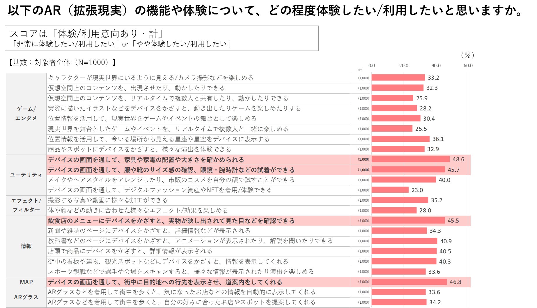 「デバイスの画面を通して、家具や家電の配置や大きさを確かめられる」「デバイスの画面を通して、服や靴のサイズ感の確認、眼鏡・腕時計などの試着ができる」などのユーティリティ関連機能や「飲食店のメニューにデバイスをかざすと、実物が映し出されて見た目やボリュームなどを確認できる」などの情報関連、「デバイスの画面を通して、町中に目的地への行先を表示させ、道案内をしてくれる」のナビ機能が関心の高い項目として上位に挙がる。