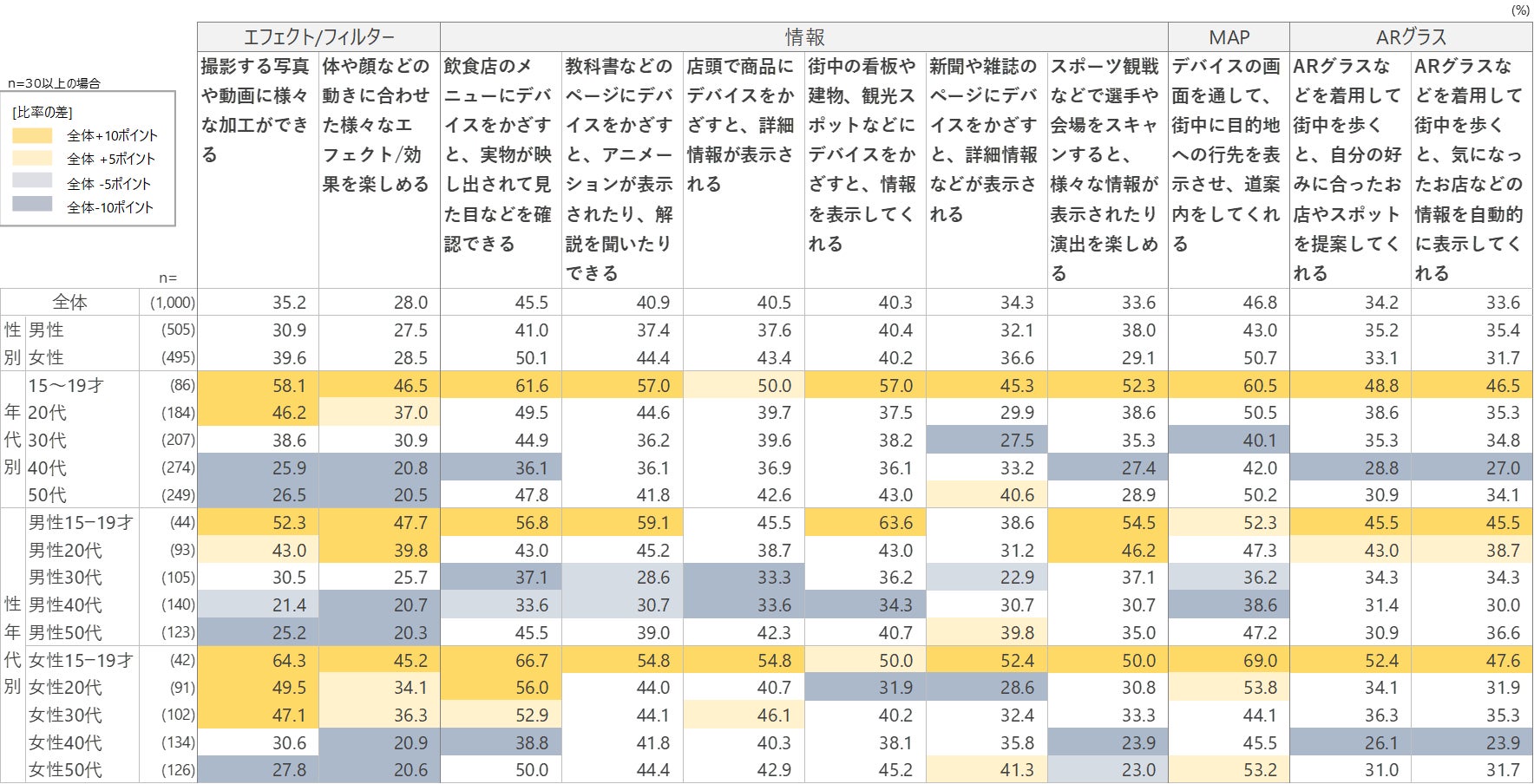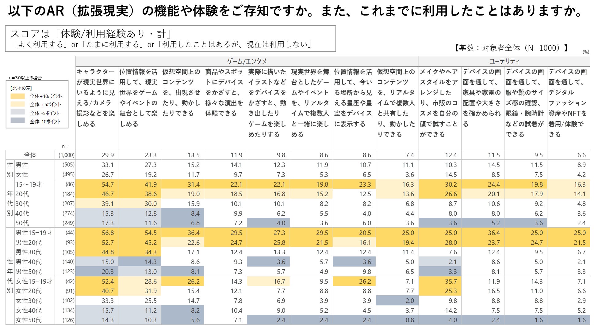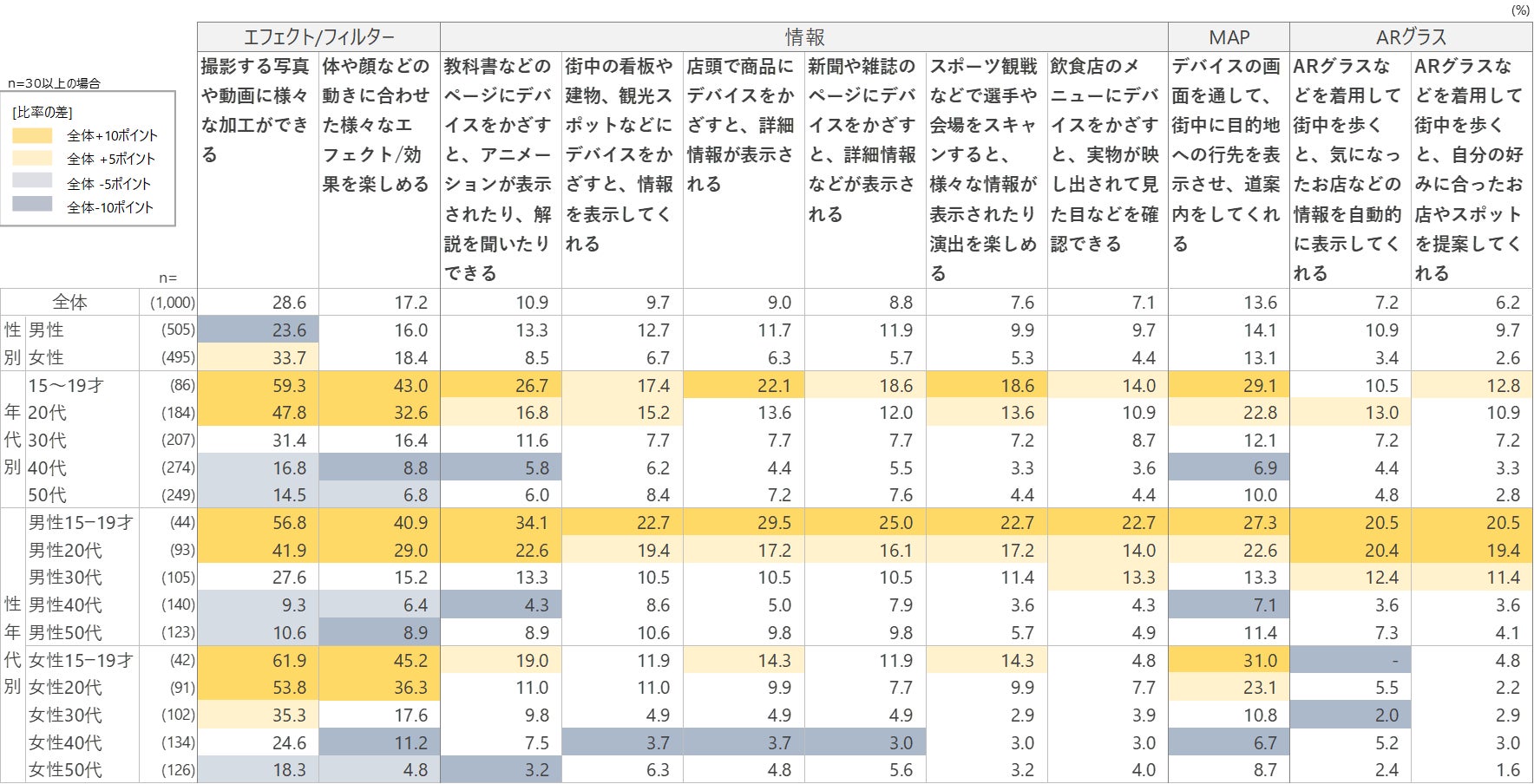 また、10代~20代で利用経験が高く、特に男性10代はゲーム/エンタメやユーティリティ、エフェクト/フィルターの他、情報やナビ、ARグラスなど多くの項目について利用経験率が2割を超える。