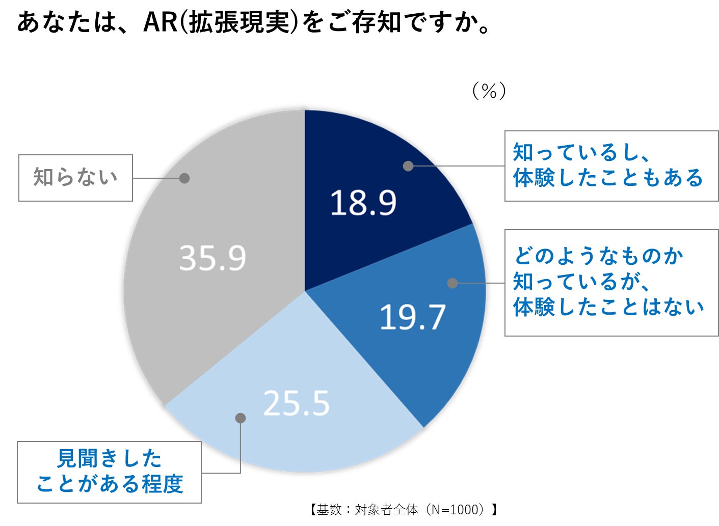 ARの概念を提示したうえで認知・利用状況を確認すると、ARの認知率は6割半ば。どのようなものかまで理解している人は4割弱。体験したことがある人は2割弱にとどまる。