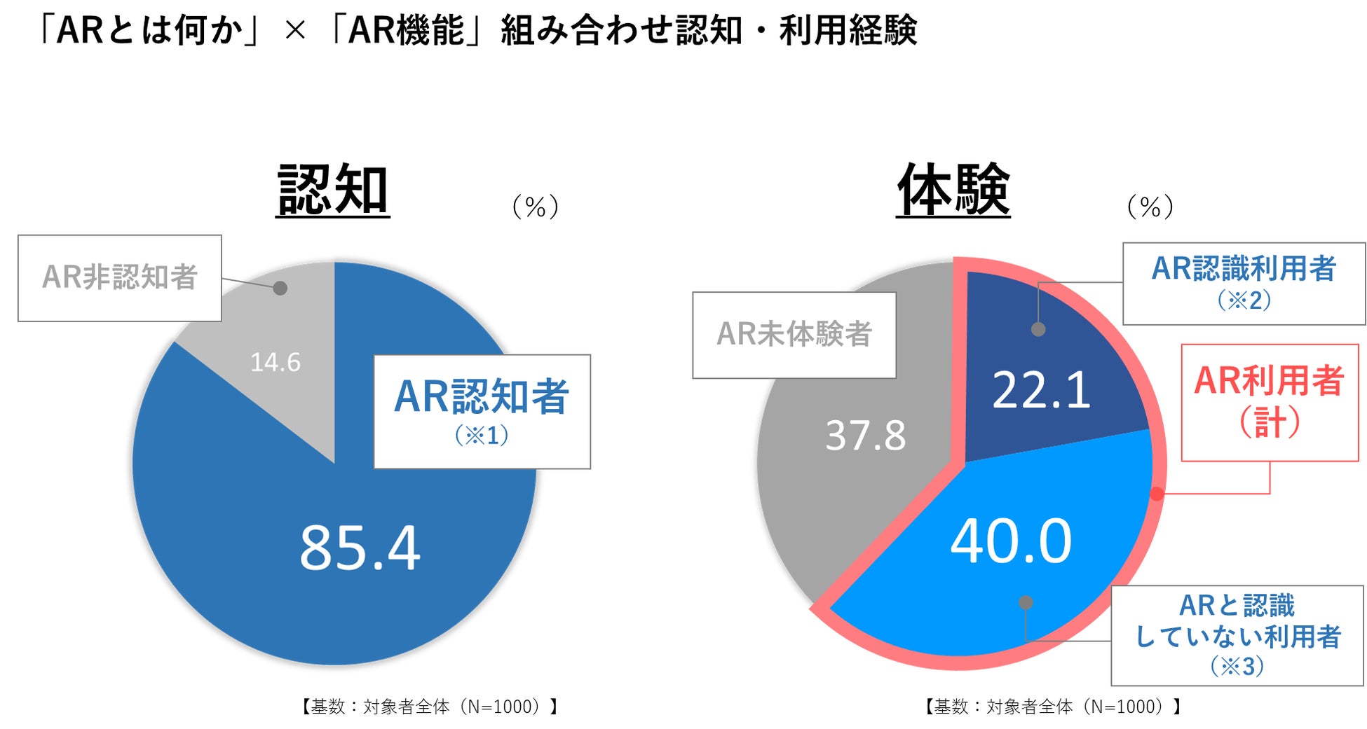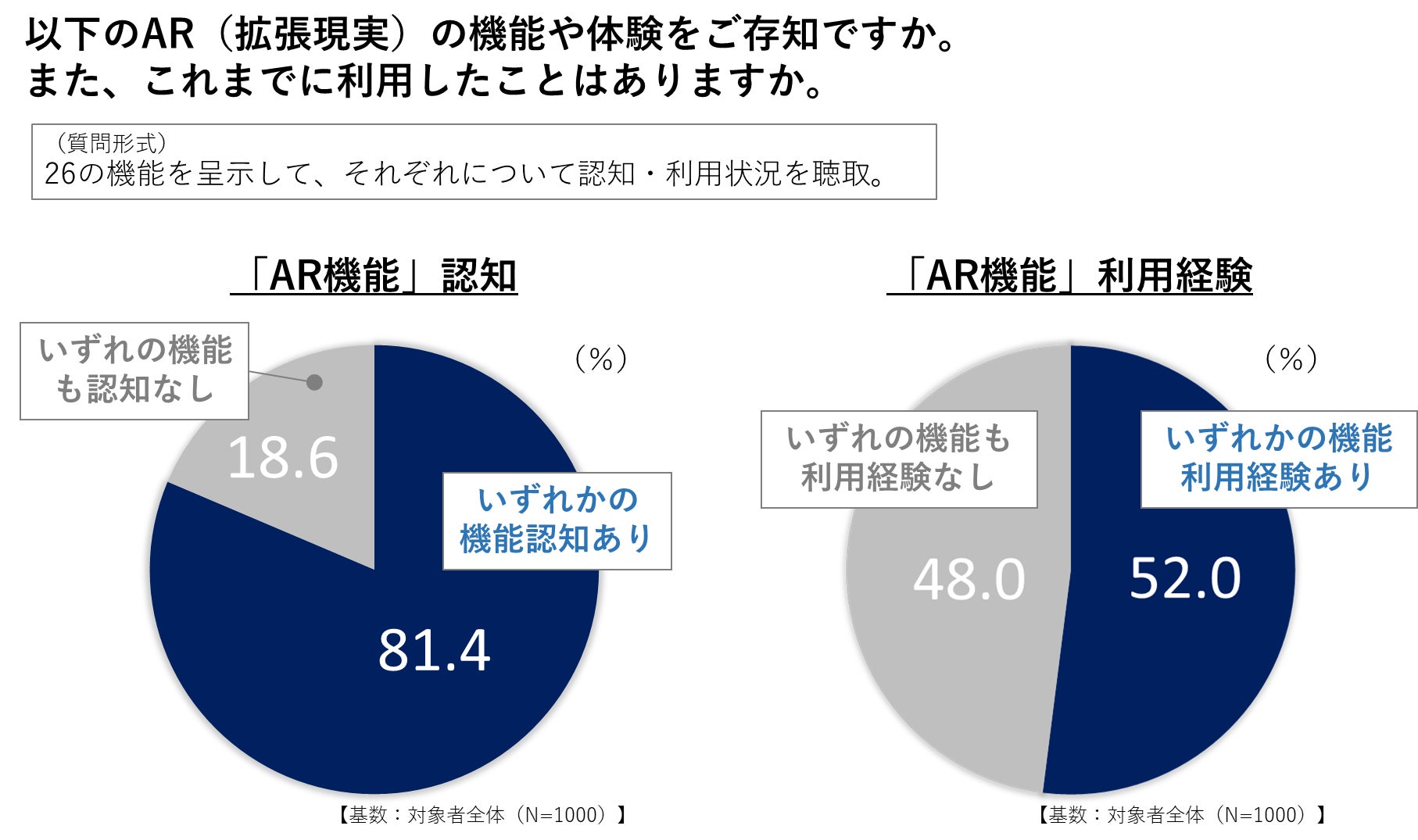 - 目的:世の中におけるARの「認知」や「利用実態」の現状把握。ARが持つ価値・ベネフィットを把握し、今後の浸透策や活用方法の検討を行う。
