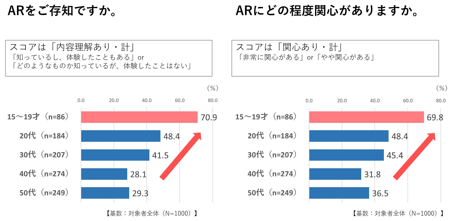 年齢が若いほどAR認知、関心は高い。特に10代は他の年代を大きく上回る。