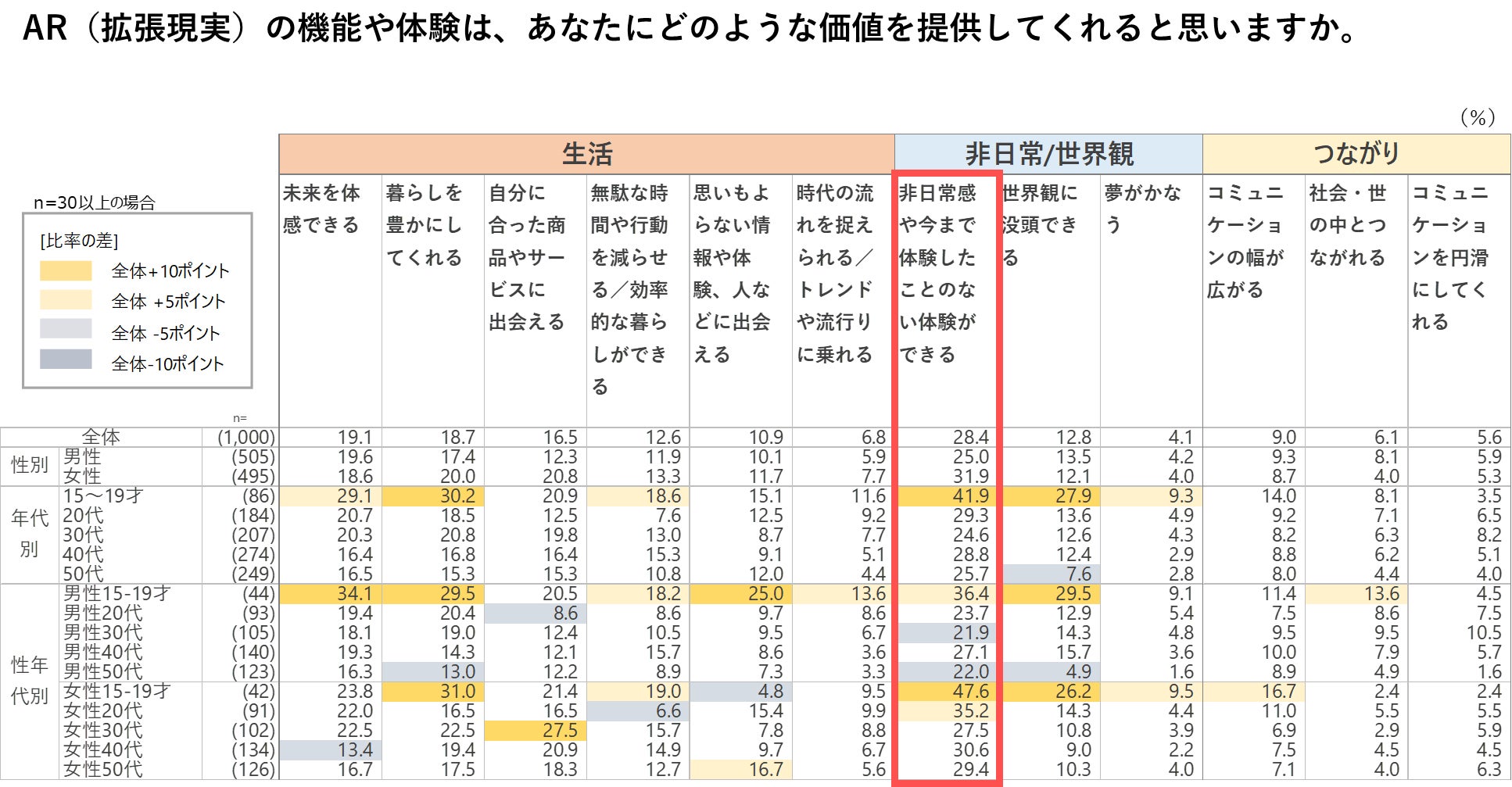生活者はARのアプリケーションに楽しさやクリエイティビティなどを期待している。ユースケース別で重要度は変わると考えられるが、感性を刺激する「ワクワク」がある体験を企画・設計することが重要。