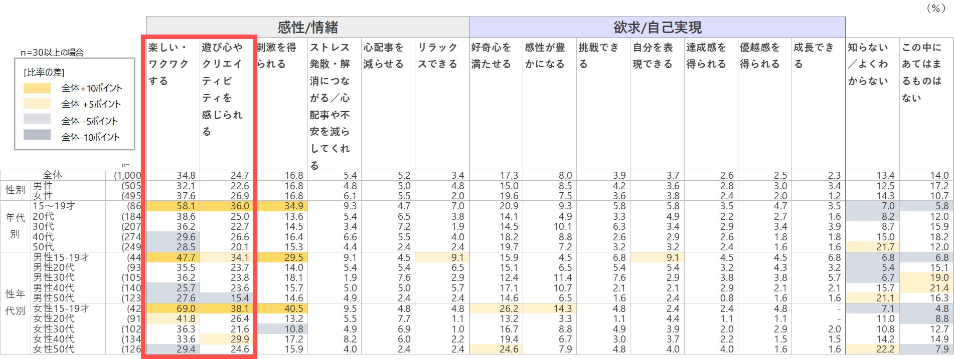 全体的に10代の関心が高い結果となっているが、特に女性10代の機能全般への関心が高い傾向が見て取れる。また、ユーティリティを始めとして撮影する写真や動画への加工(エフェクト/フィルター)やデバイスをかざして演出などの情報が投影される機能(ゲーム/エンタメ、情報)、ナビは男性よりも女性の方が関心が高い。