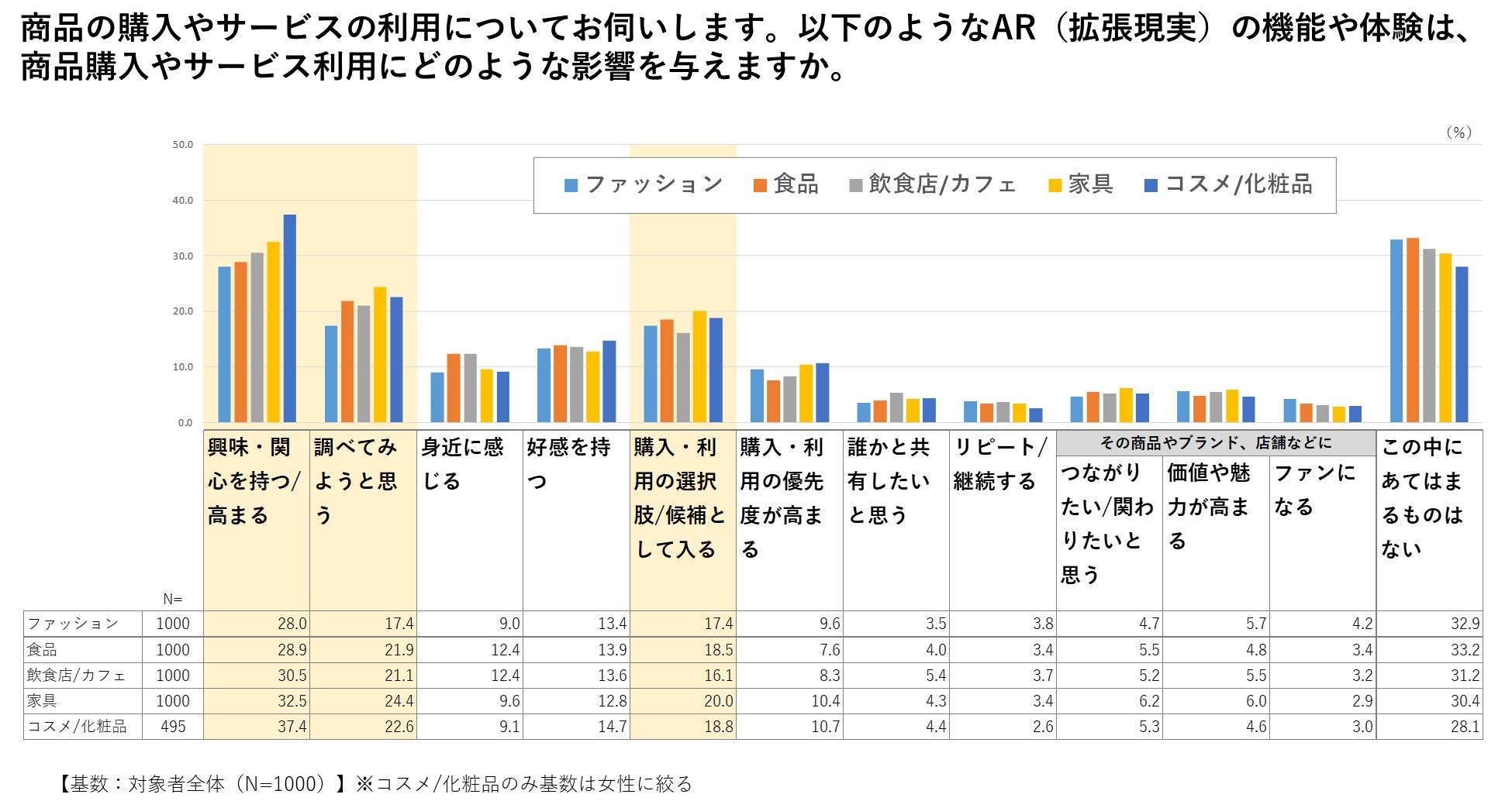ARはカスタマージャーニーにおいて「興味・関心」「情報収集行動」への貢献が高い。また、商品購入やARを搭載・活用したサービス利用については、「家具」「飲食店/カフェ」「食品」で購入・利用の選択肢/候補への影響度も他と比べて高い傾向にある。