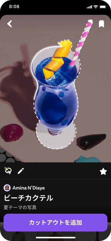 • 自分のカメラロール(マイアルバム)やピンとボードから、または新しいピンを検索して、素材を切り取ります。