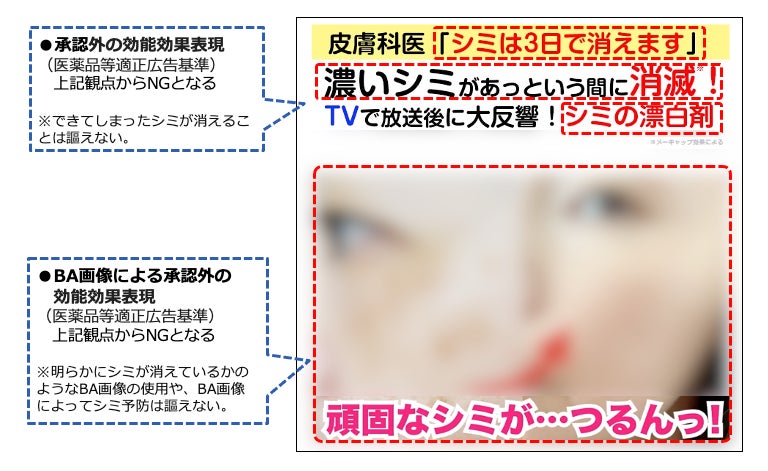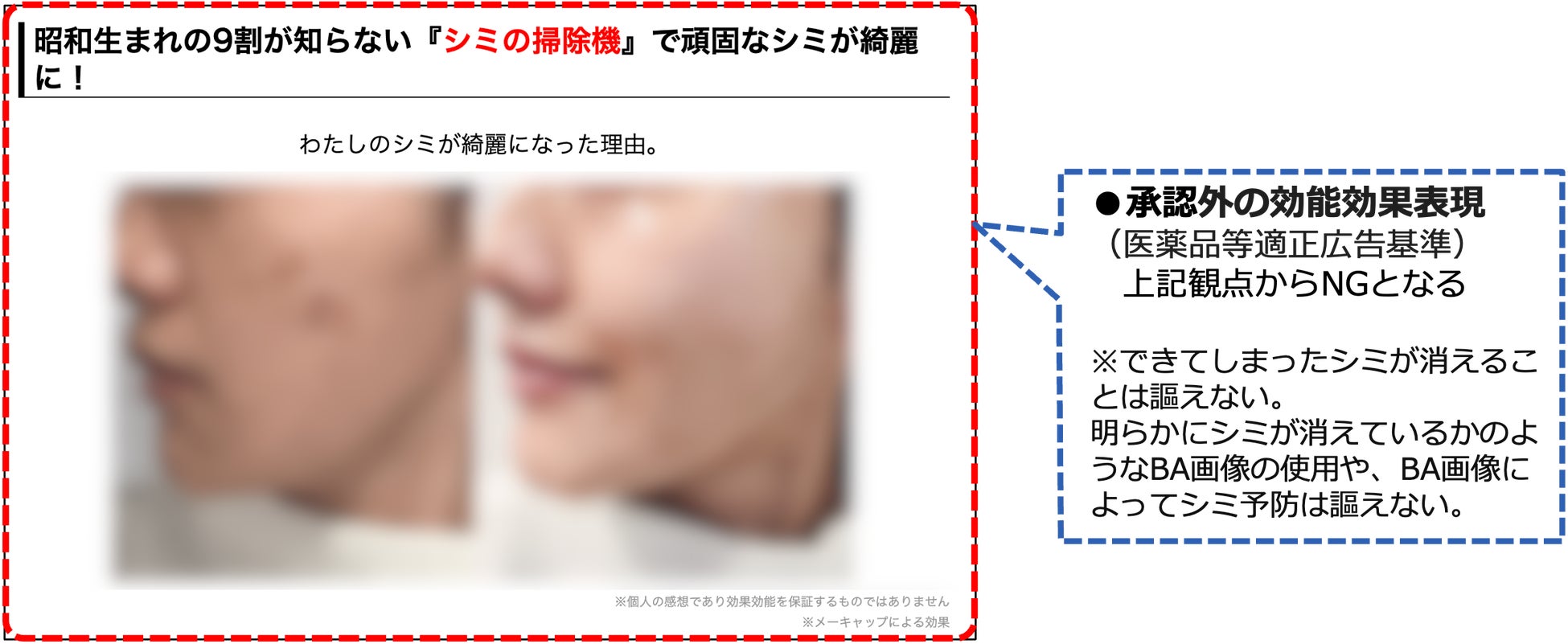 ①しみやしわに関する商材において、承認を受けていないにもかかわらず、あたかもしみやしわが改善されるような効能効果表現をしているもの(Before After画像を用いた体験談風訴求含む)。