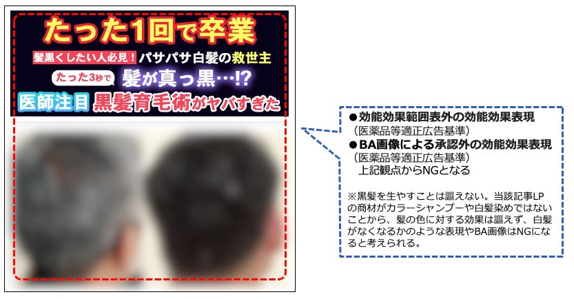 調査対象期間において特に薬機法の観点から、法令を違反していると考えられうる表現を含む記事LPの一部をまとめています。[2]