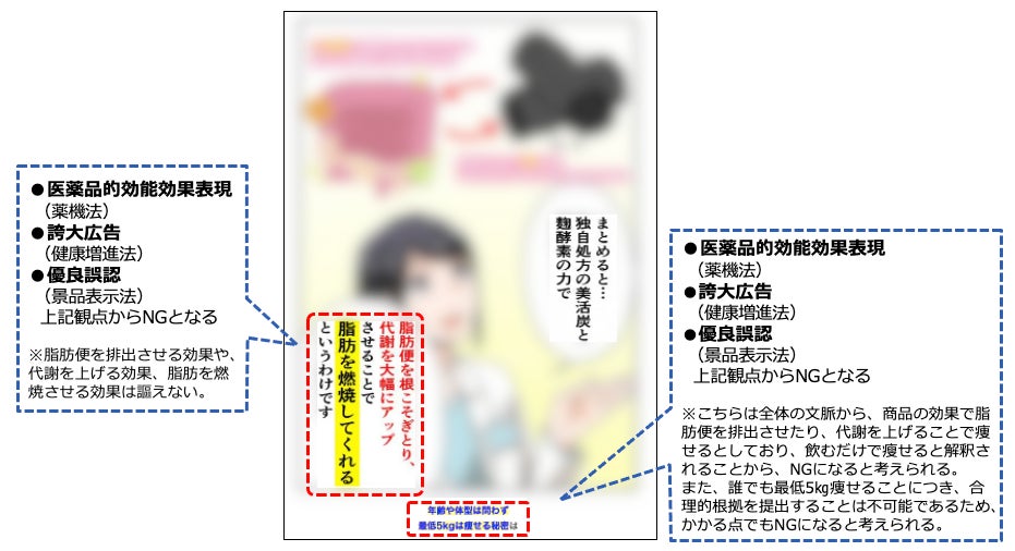 ②健康食品に該当する商材において、医薬品的効能効果表現(薬機法)や誇大広告(健康増進法)もしくは優良誤認(景品表示法)と捉えられる表現をしているもの、つまり飲むだけで痩せるかのような表現や、BA画像との組み合わせで過度に痩せるという表現をしているもの。