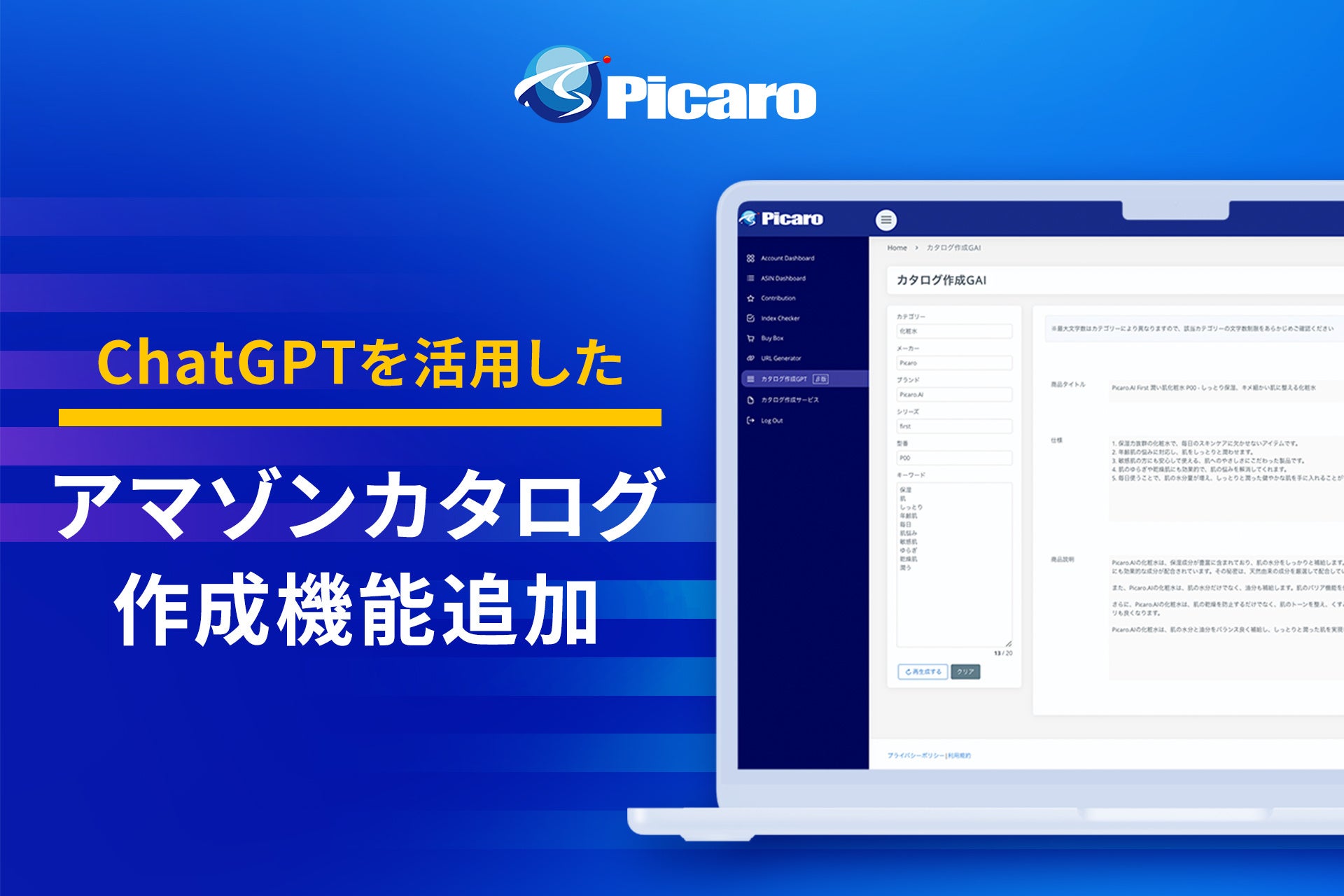 株式会社Picaro.AI(本社:神奈川県藤沢市、代表取締役:下平季位、以下Picaro.AI)は、アマゾン売上拡大支援ツール「Picaro.AI」のChatGPTを活用したアマゾン商品ページ(カタログ)作成機能「カタログ作成GAI(β)」に、「医薬品、医療機器等の品質、有効性及び安全性の確保等に関する法律」(以下:薬機法)への対応機能を追加しました。