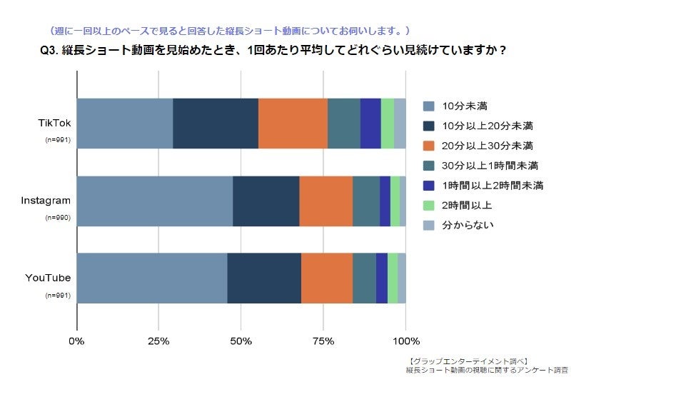 株式会社GLAPentertainment(読み:グラップエンターテイメント 以下当社 所在地: 東京都渋谷区、代表取締役:坂本大輔)は、20代~40代男女2,972名を対象に「縦型ショート動画の視聴に関するユーザーアンケート調査」を実施しました。(本調査回答:TikTok 991名、Instagram リール 990名、YouTube ショート991名)