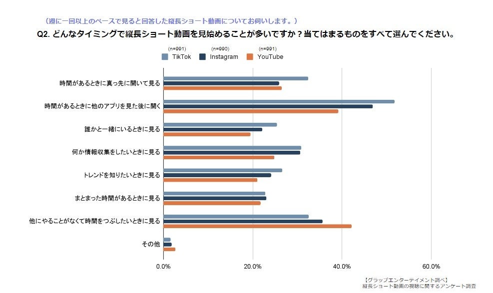 「どんなタイミングで縦型ショート動画を見始めることが多いですか?当てはまるものをすべて選んでください。」という質問では、プラットフォームでいくつか特徴的な点が見られました。