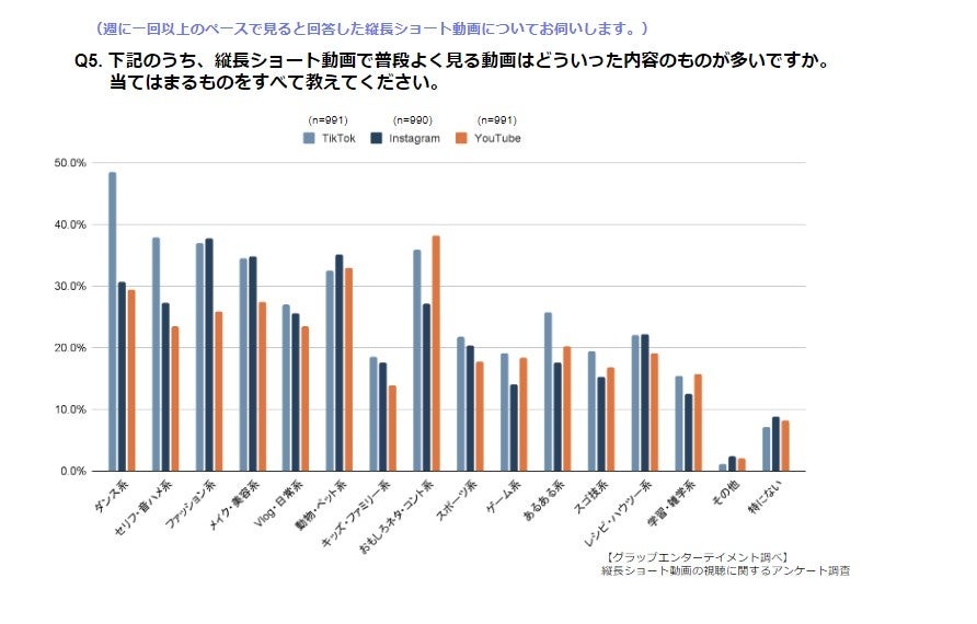 TikTokでは、中でもダンス系(48.6%)が飛びぬけて多く、Instagramの30.7%、YouTubeの29.5%と比較しても約20%程度多いことがわかります。次に「セリフ・音ハメ系(38.0%)」も他のプラットフォームより多くみられ、TikTokといえば「ダンス」「セリフ・音ハメ」という印象の通りの結果ともいえます。