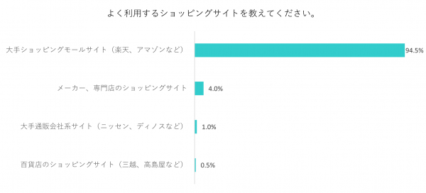 「大手ショッピングモールサイト(楽天、アマゾンなど)」が最も多く94.5%でした。次いで「メーカー、専門店のショッピングサイト」4%、「大手通販会社系サイト(ニッセン、ディノスなど)」1%、「百貨店のショッピングサイト(三越、高島屋など)」0.5%でした。