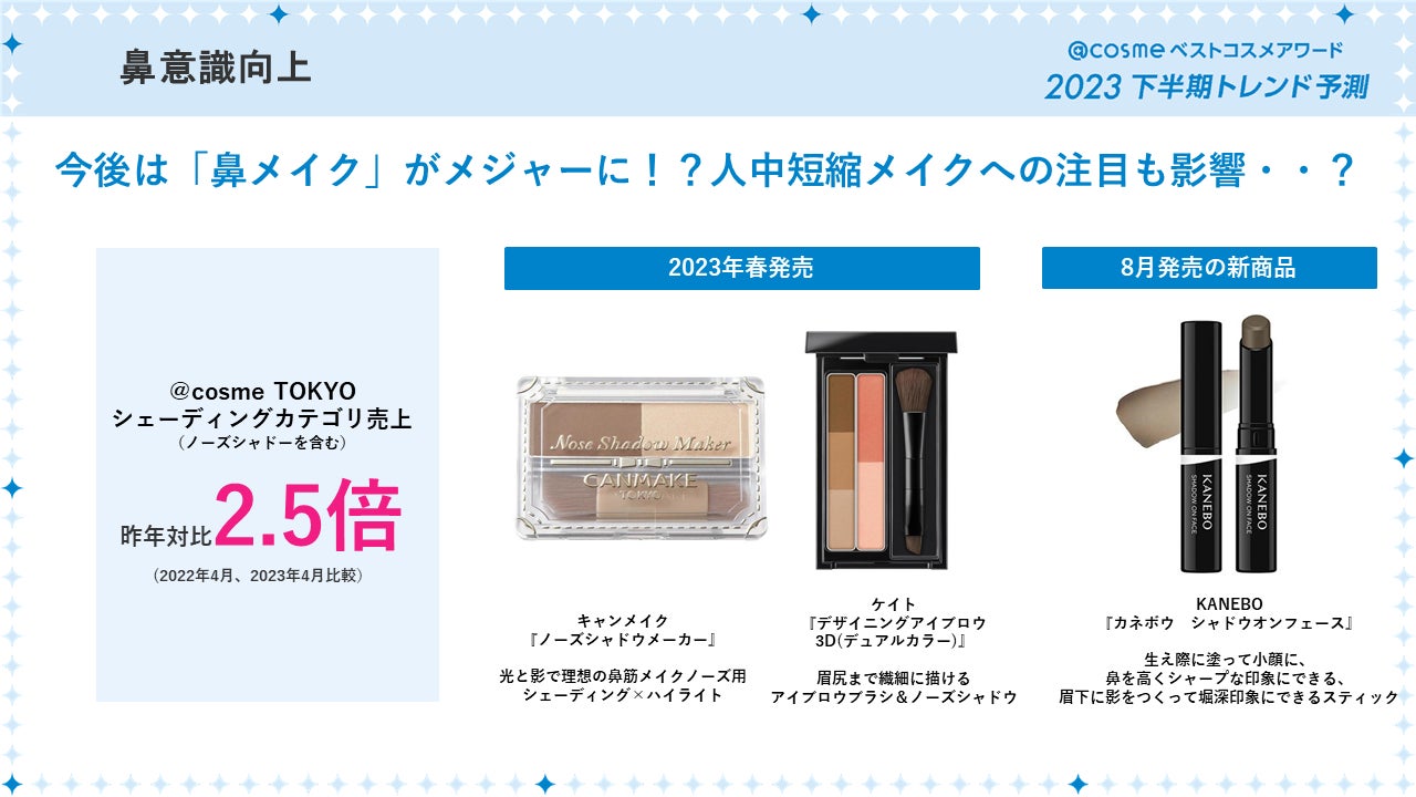 本日発表の「@cosmeベストコスメアワード2023 上半期新作ベストコスメ」でも、ディオール「 ディオール アディクト リップ マキシマイザー」が総合大賞を受賞しました。このようなメイク需要の高まりと共に上半期はリップメイクや口元への関心が集まりましたが、今後はこれまでマスクの下に隠れていた「鼻」への意識が高まり、注目のパーツになると予想されます。