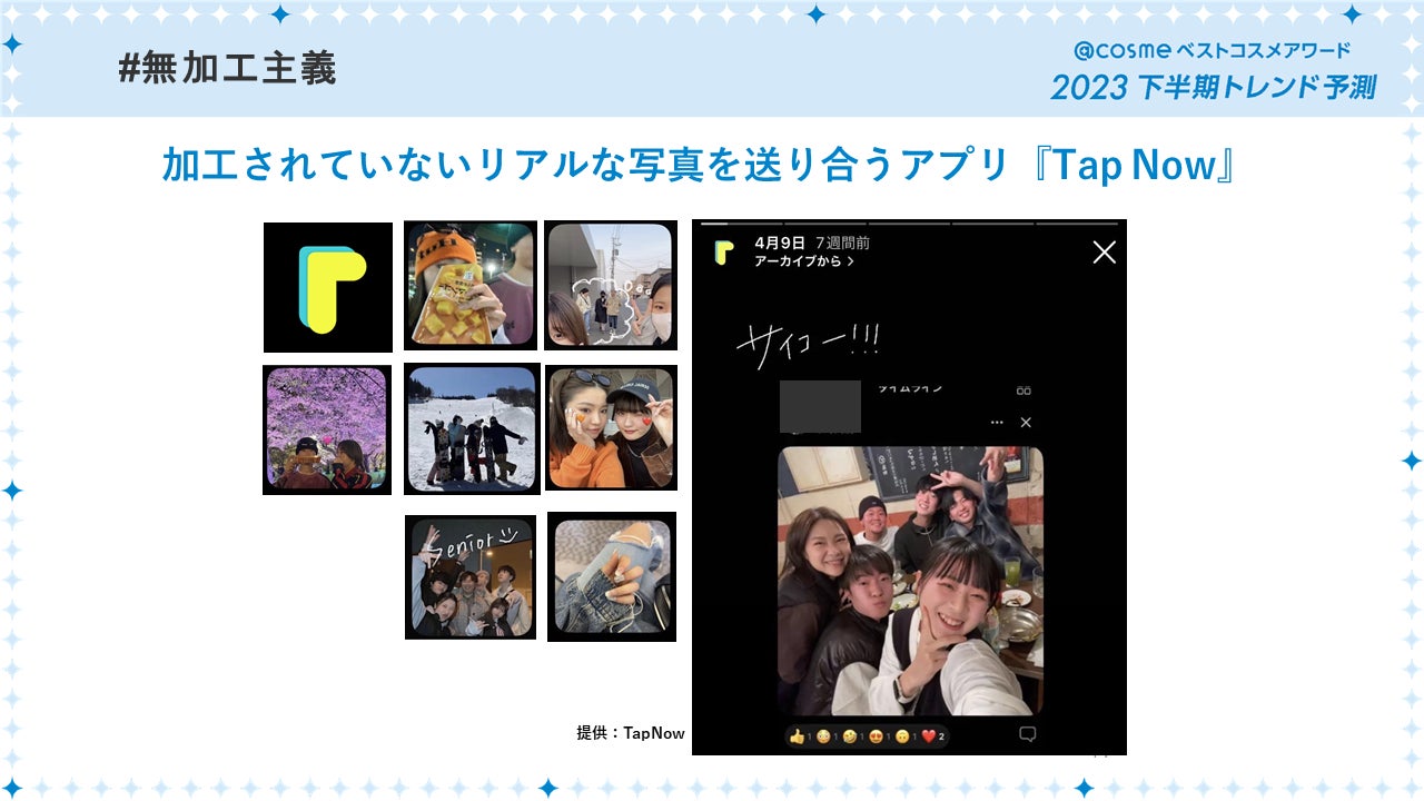 このような新しい動きはSNS自体にも現れています。昨年4月にサービスリリースし、現在Z世代を中心に人気を集めるSNSアプリ「TapNow」は、写真や動画を互いのスマートフォンのホーム画面に送り合うことができるのが特徴です。フィルターや写真編集の機能は実装されておらず、気心の知れた仲間同士で、加工されていないリアルな写真を送りあえる手軽さが評価されているようです。