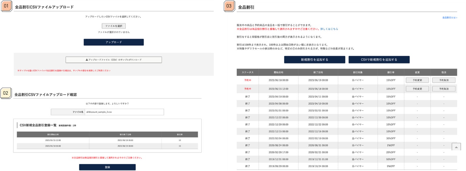 この度の機能改善では、セール期間と割引率を記載したCSVをアップロードするだけで、割引登録ができるようになりました。