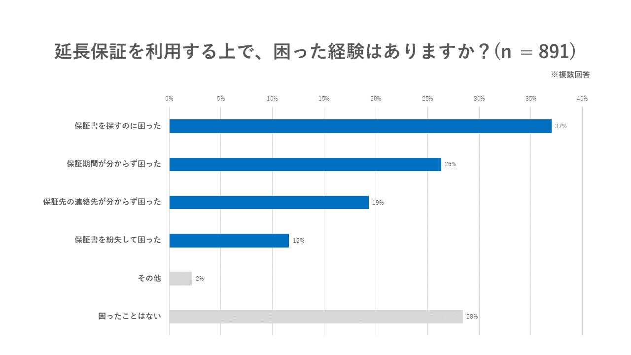 「保証書を探すのに困った」:37%、「保証期間が分からず困った」:26%、「保証先の連絡先が分からず困った」:19%、「保証書を紛失して困った」:12%など、保証書に記載されている情報や保証書自体がすぐに見つからず困ったというようなことを多くの人々が経験。