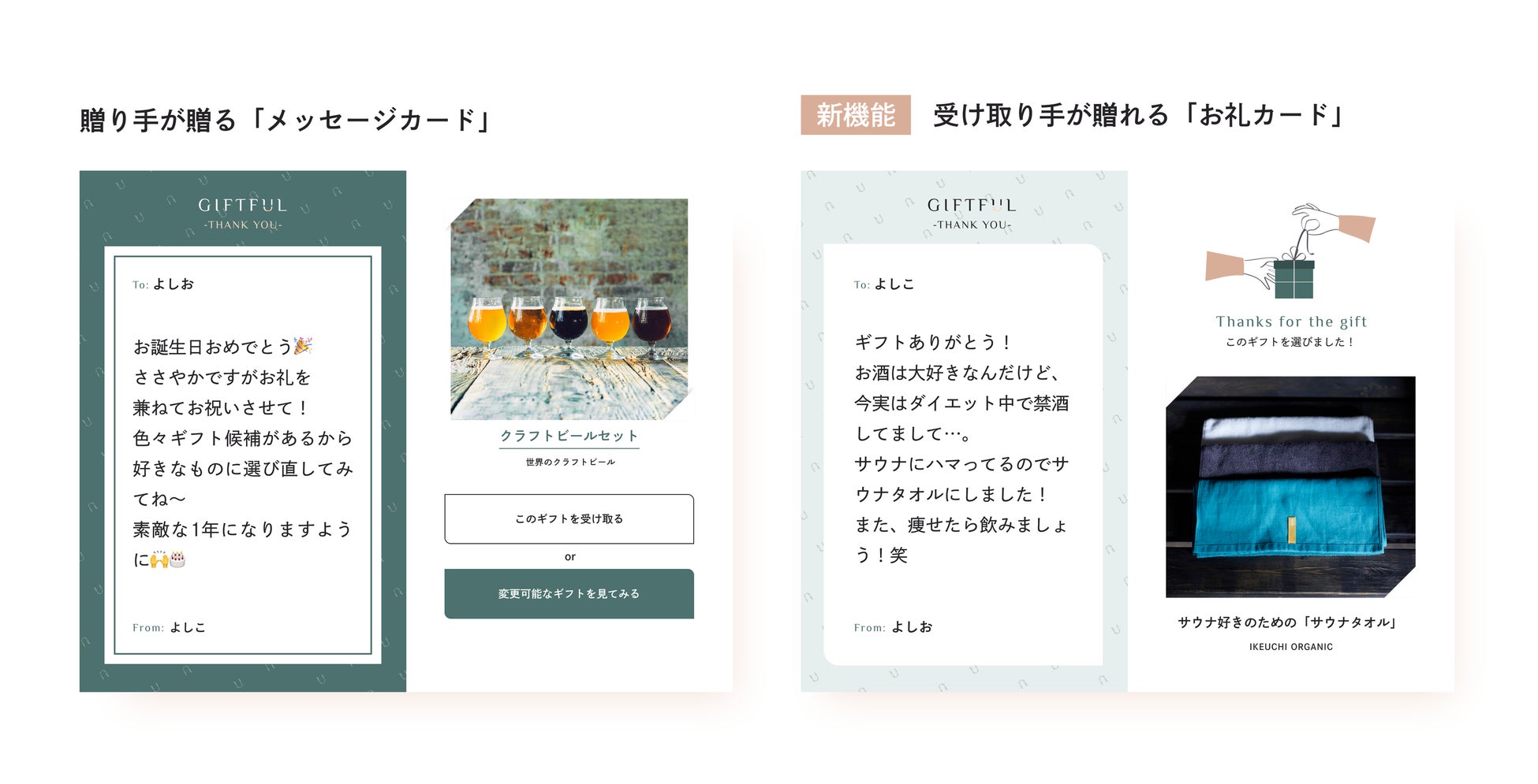 これまでは、贈り手が受け取り手に対してメッセージカードを贈れるだけでしたが、新機能のリリースにより、受け取り手もお礼カードで感謝の気持ちを伝えられるようになりました。もちろん、ギフトを選び直さずにそのまま受け取った方も、気軽に相手に感謝の気持ちを伝えられます。