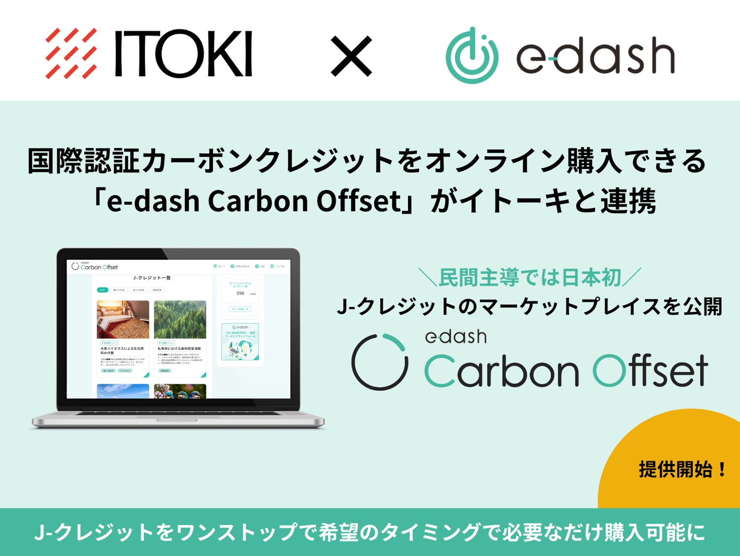 株式会社イトーキ(本社:東京都中央区、社長:湊 宏司)は、CO2排出量可視化のクラウドサービス「e-dash」を提供するe-dash株式会社(本社:東京都千代田区、代表取締役社長:山崎冬馬)との連携により、カーボン・クレジット(注1)のマーケットプレイス「e-dash Carbon Offset」上で、2023年5月30日(火)よりJ-クレジット(注2)の販売を開始したことをお知らせします。